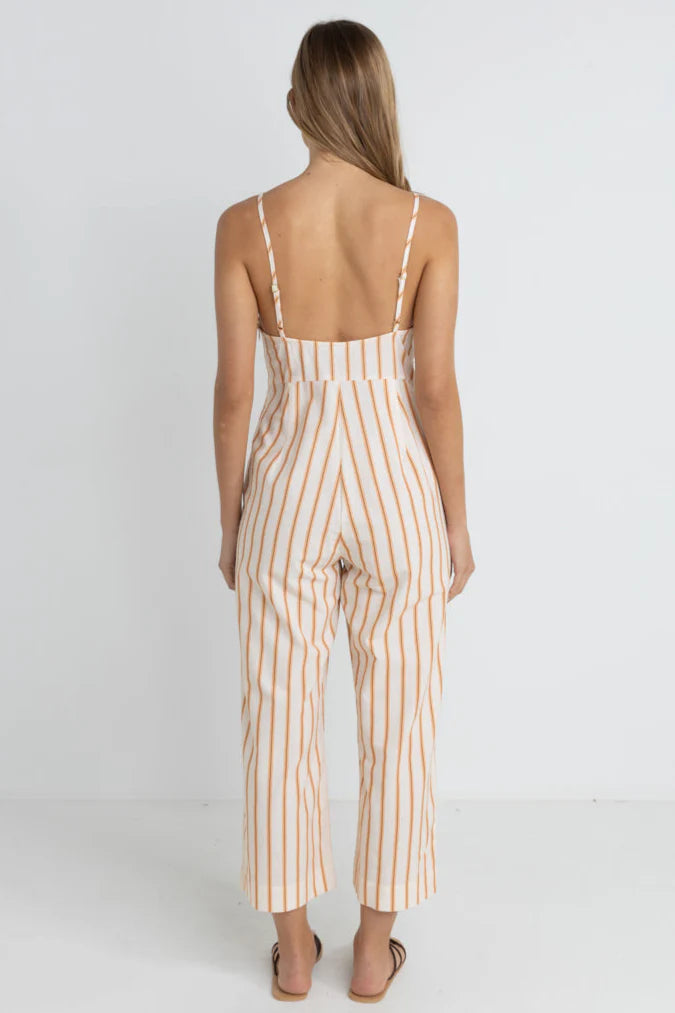 This stripe jumpsuit can easily be dressed up or down depending on the occasion and is made from a cotton-linen blend. It features a v-neck line, adjustable straps, wide legs, and an invisible side zipper.
