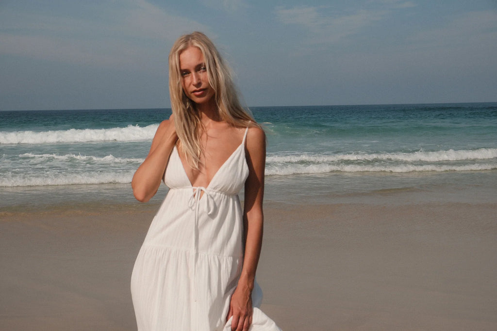 The Jaci Maxi Dress in White is a flowing, feminine dress with a modern front cutout. Easy to wear and perfect for a sun-kissed evening. Made with 100% cotton.