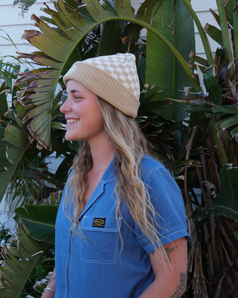 The beanie features a bold, classic checkered pattern, offering warmth and style for chilly days. Perfect for adding a pop of pattern to any outfit.
