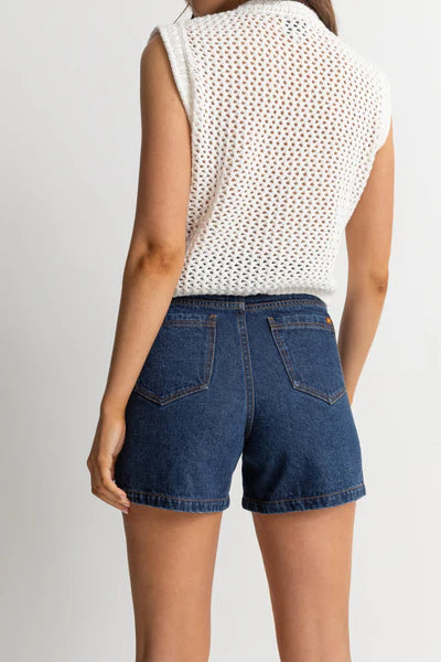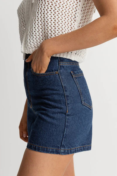 A wardrobe staple, the Escape Denim Shorts in a classic dark-denim wash feature a comfortable, snug waist and relaxed fit, providing year-round comfort